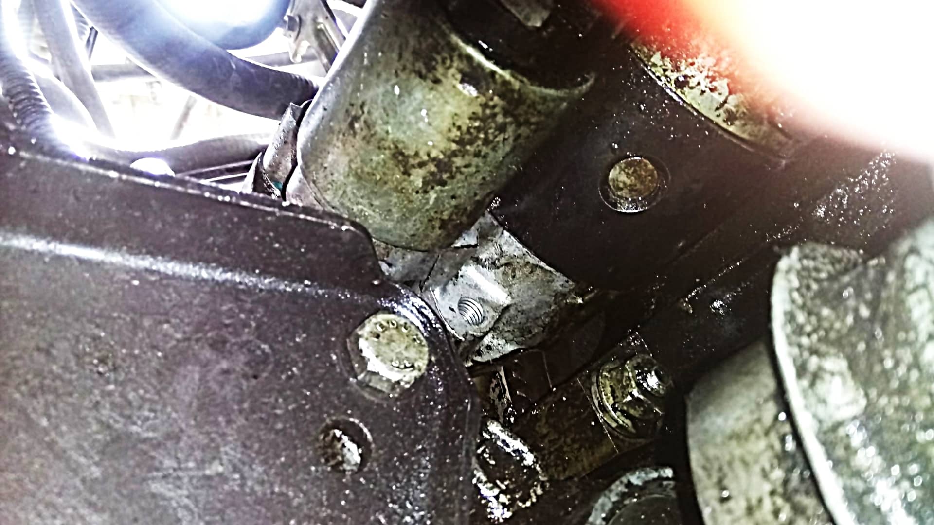 Vue par dessous la voiture, le démarreur est au même niveau que l’alternateur, mais coté conducteur. Il y a 3 câbles électriques : celui qui relie le solénoïde au moteur (il n’est donc pas nécessaire de l’enlever pour le retrait du démarreur), celui qui relie le solénoïde au pôle positif de la batterie (écrou de 13) et celui qui relie le solénoïde au neiman (pas d’écrou pour celui-ci, c’est une cosse).